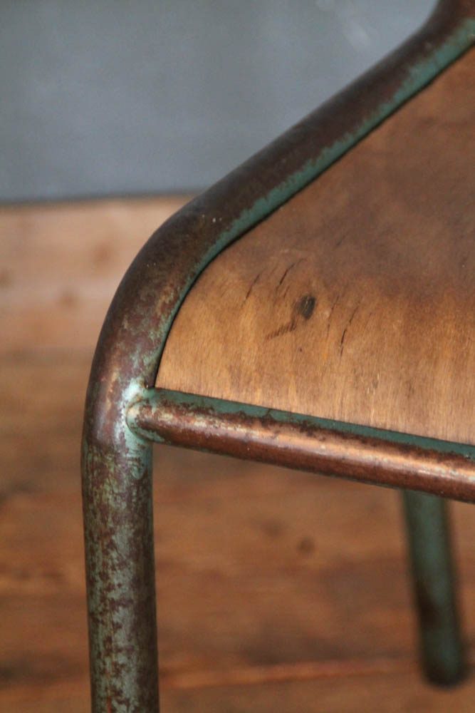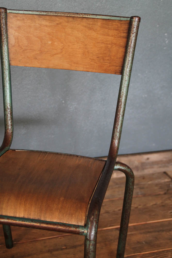 1950s French school chairs made with folded welded tubulars and shaped plywood. Restored, green in colour and wood.