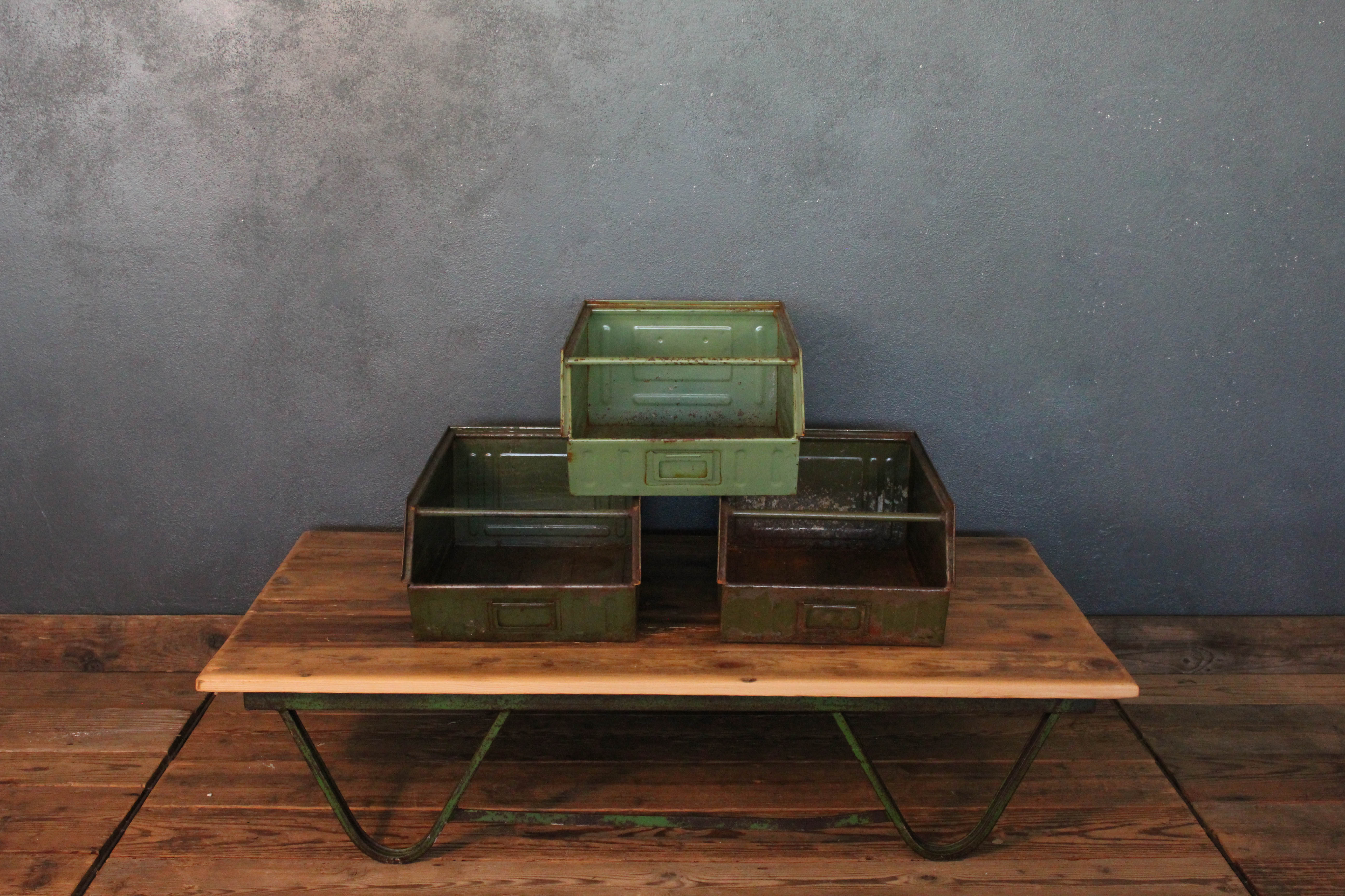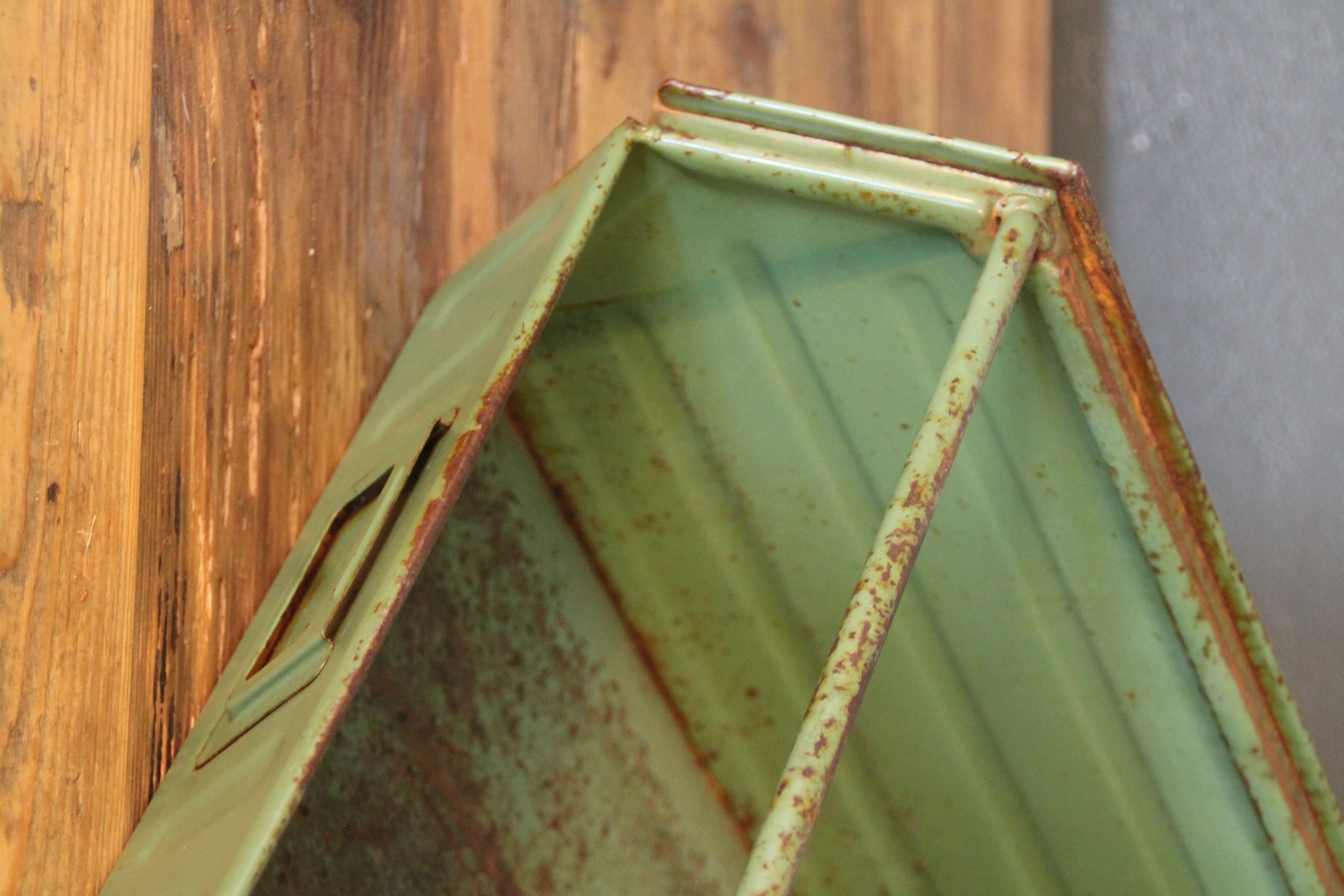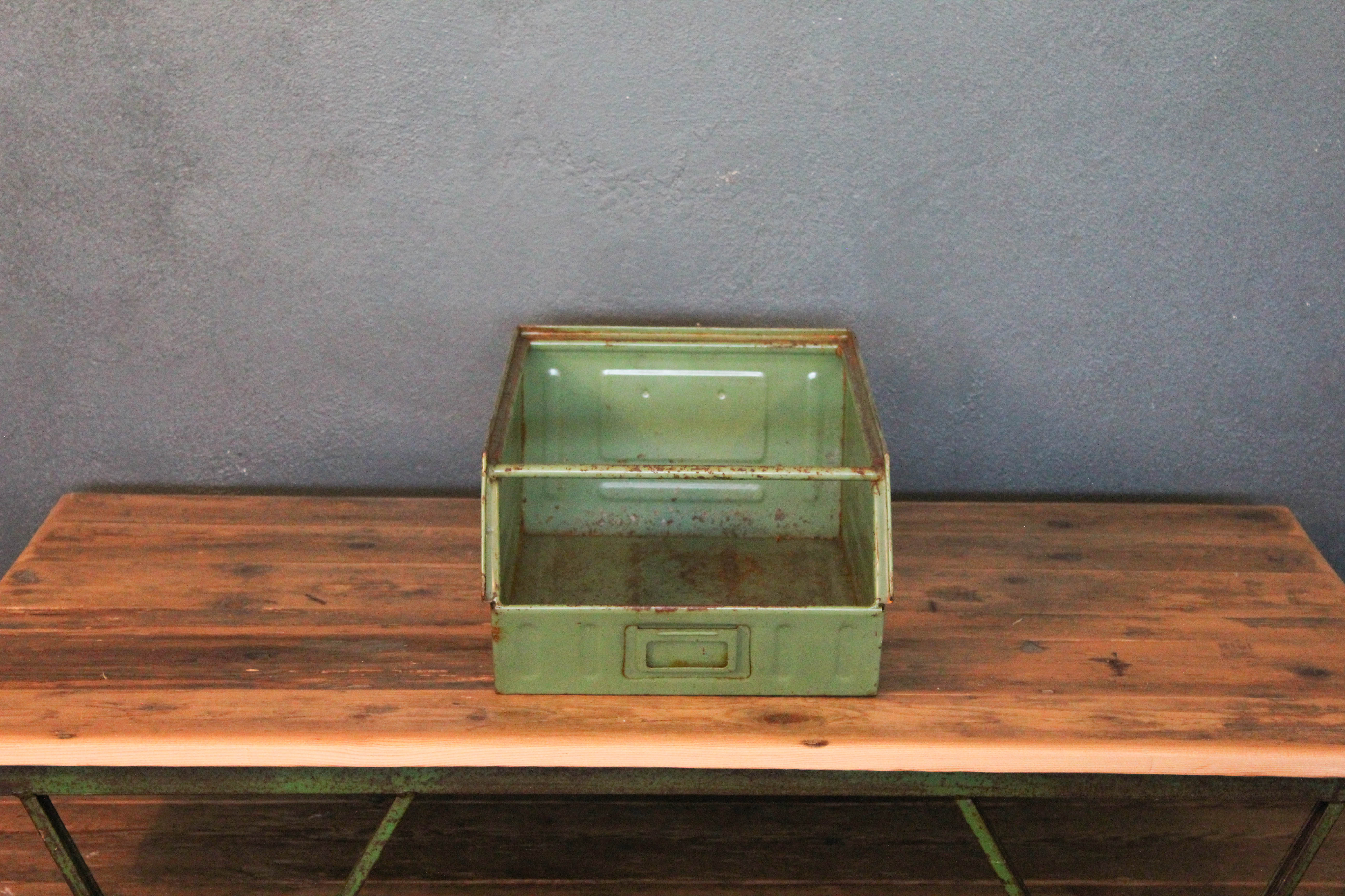 1950s second-hand green iron industrial crate. Fitted with a handle and