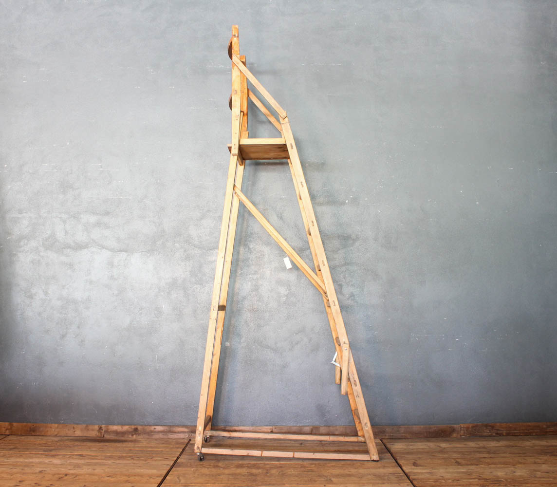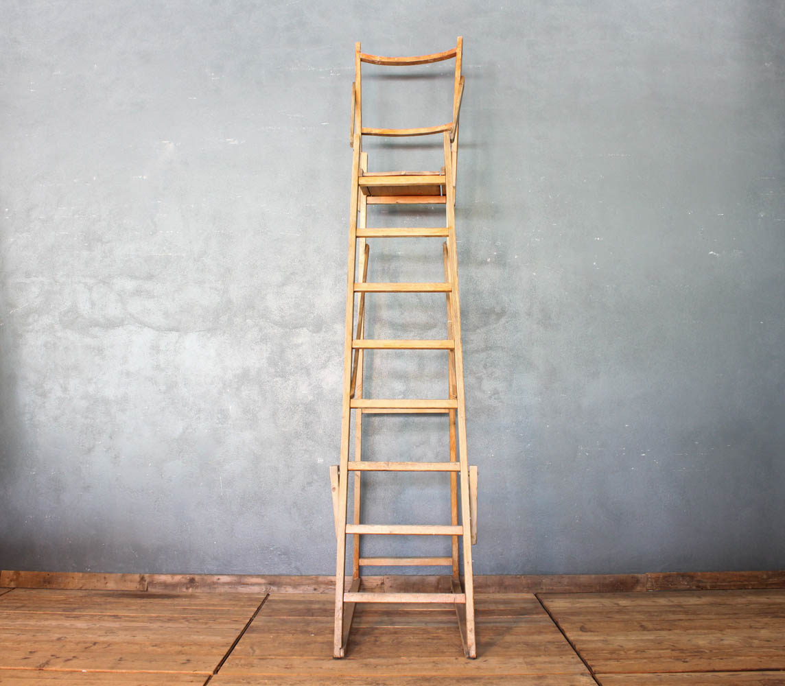 1950s fir wood shop ladder with seat. Foldable and portable, natural wood colour.