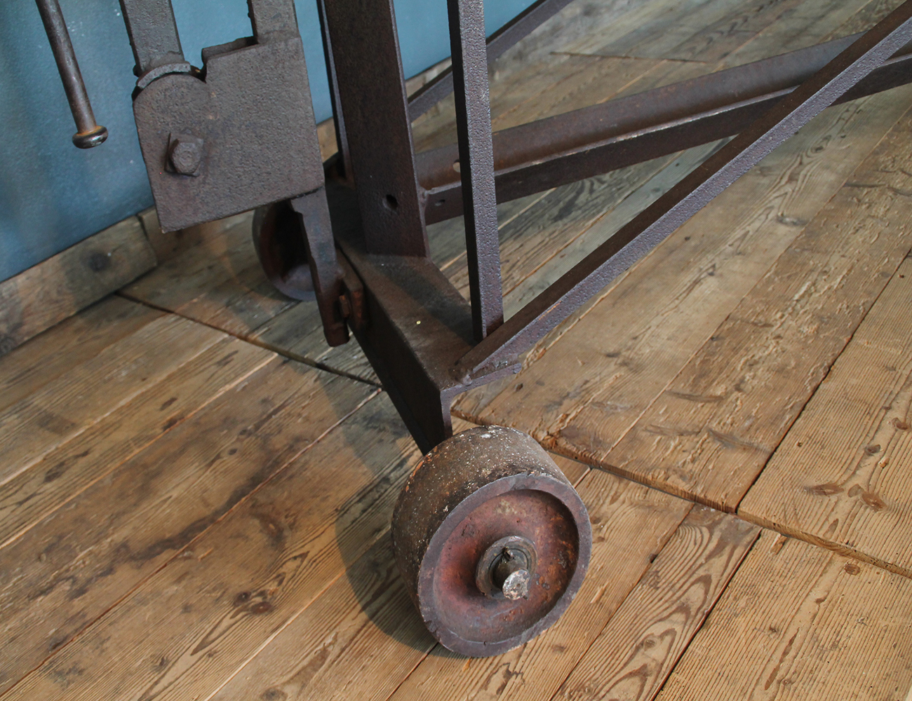Early 1900 iron and industrial wood table made with a work table with vice on the short side and wheels.