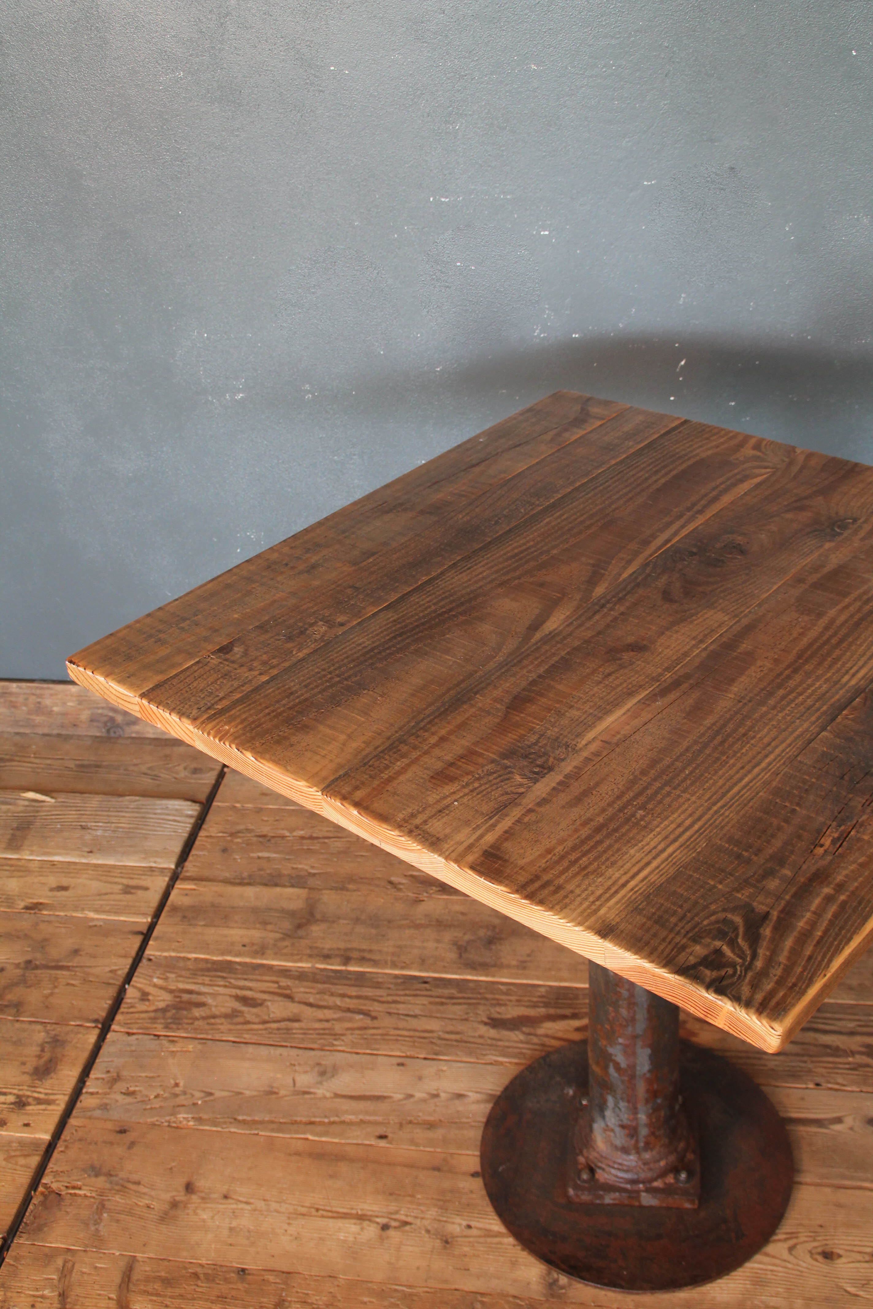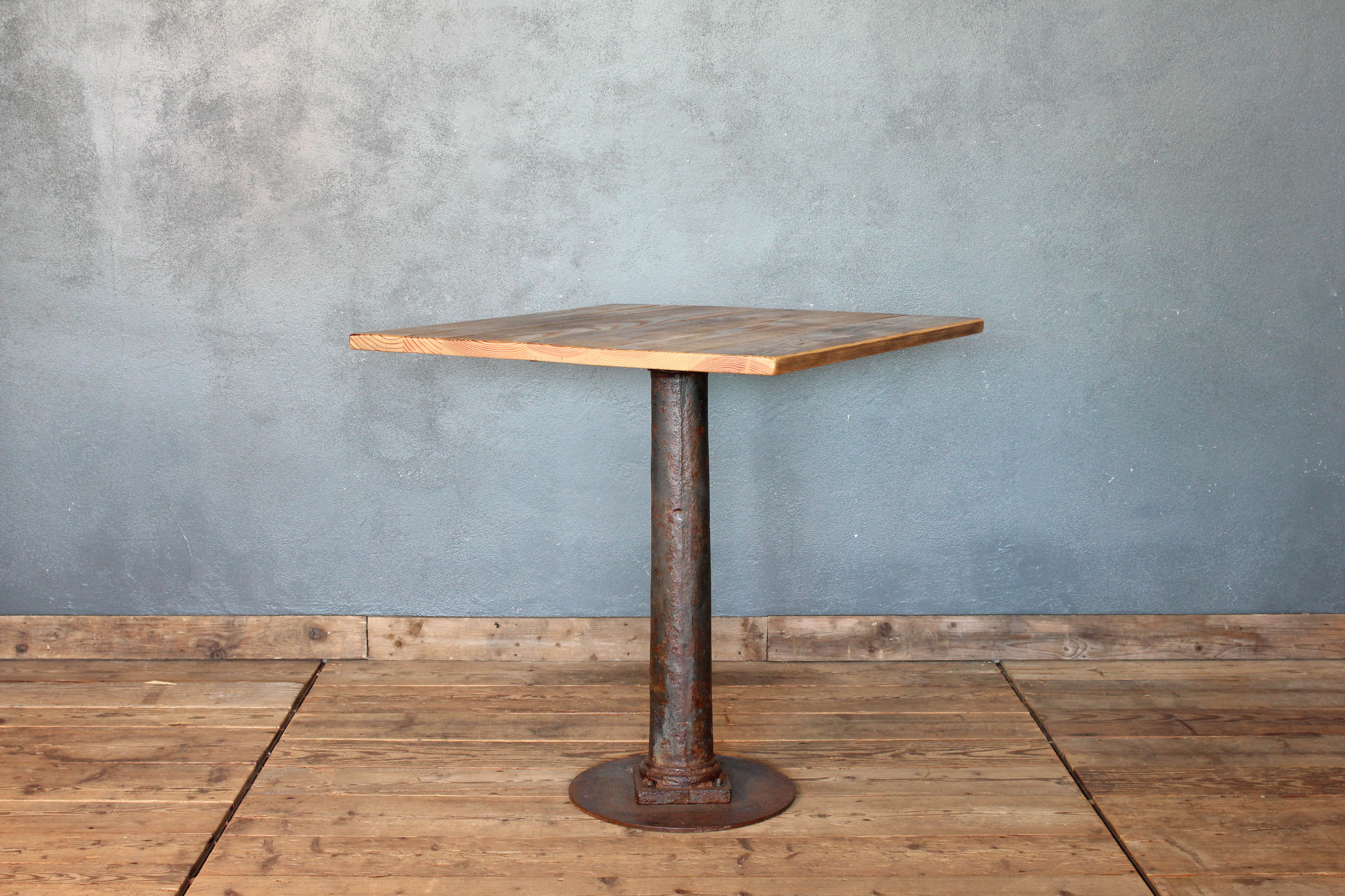 Square table consisting of a brown cast iron base and a reclaimed oak-wood top. The top has been made by using old planks.